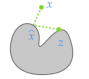 Definition: Given a set \(S \in \R^n, S \ne \emptyset\) and a point \(x \notin S\), we want to find a point in \(S\) that is closest (in terms of Euclidean distance) to \(x\). Formally, \(\hat x = \arg\min_{z \in S} ||z - x||_2\) is called the projection of \(x\) onto \(S\), denoted as \(\hat x = \Pi_S(x)\).